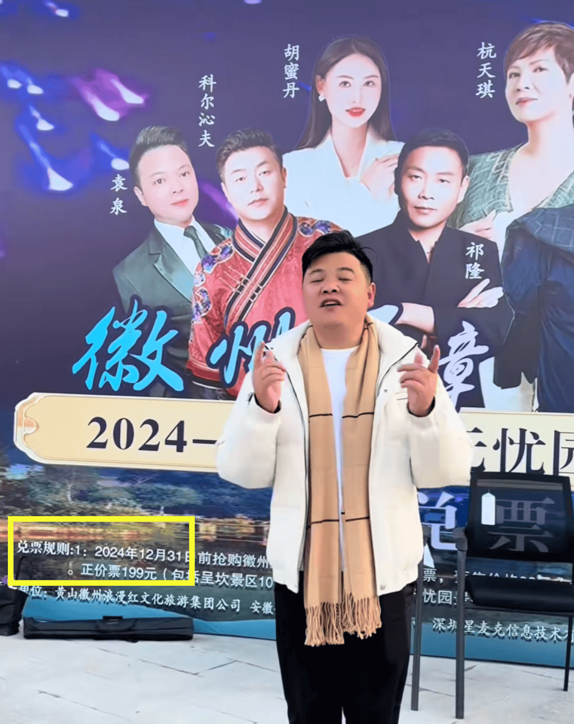 大约在三天前,歌手袁明曾分享了一段预告演出的视频,从背景不难看出,这是一场为景区宣传的活动,海报上有追多知名的歌手,其中就有杭天琪和李琼,票价大约在199元。